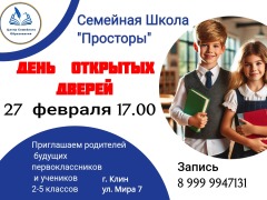 Приглашаем родителей будущих первоклассников и учеников 2 -6 класса на День открытых дверей в "Семейную Школу "Просторы" 16 апреля в 17.00